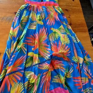 Bright blue maxi dress with vibrant tropical patterns. Features bold colors and eye-catching design. Perfect for a lively look.