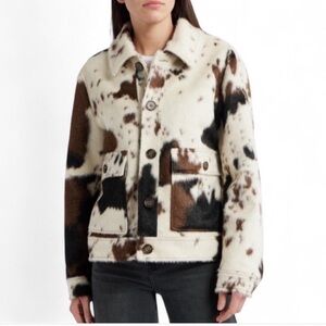 Bernardo Cow Print Faux Fur Jacket. Size: XL. Cow-inspired print enlivens this utility-informed faux fur jacket cut in a boxy silhouette and finished with prominent pockets. Cow print pattern and tortoise shell buttons adorned on faux calf hair. Cropped fit and statement design, this classic fit jacket is perfect for trend-forward layering. Features: front button closure, spread collar, button cuffs. 75% modacrylic, 25% polyester faux fur. Dry clean. New with tags