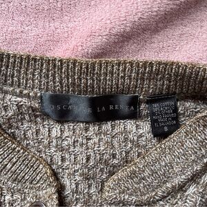 Oscar de la renta sweater. 74% cotton 24% acrylic 2% other hand framed in El Salvador. Size small. Good condition but notice last pics shows it’s been stitched with green thread at the right underarm