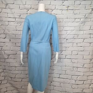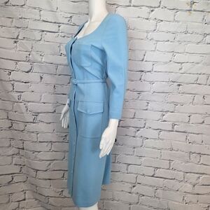 This dress from Sport Max is made from a stretch waffle knit. It has a fitted silhouette with a button down front. It has pockets details and a matching belt at the waist. It has a square neckline and 3/4 sleeves. It is in great used condition.