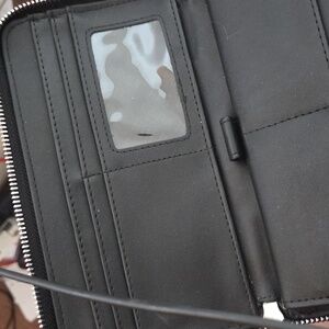 Black Steve Madden wallet. zip front compartment (never used that one so cant tell you for sure what will fit in there) LOTS of card slots and id slot. Inner zip compartment for change. Pen holder.