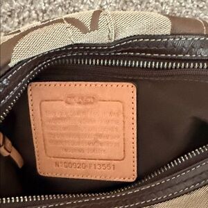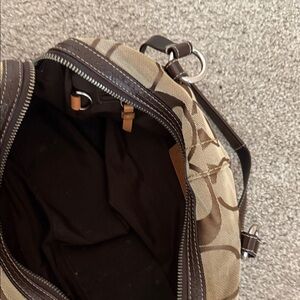 Stylish Coach satchel with signature pattern. Features tan and brown tones. Perfect for everyday elegance.