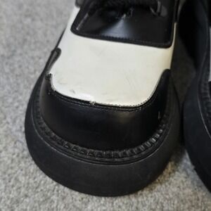 Authentic John Fluevog Bunks platform shoes featuring the brand's iconic chunky silhouette and bold black & white leather design. Known for their cult following, Fluevog Bunks are a favorite among goth, punk, alternative, and statement-shoe collectors.