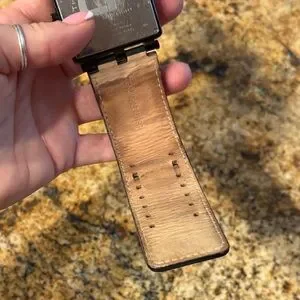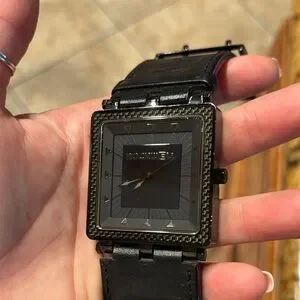 Sleek black leather watch by Rockwell. Features a square face with a minimalist design.