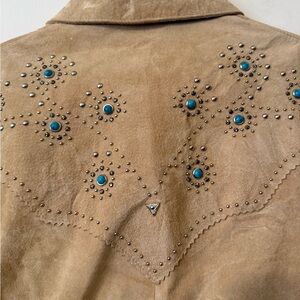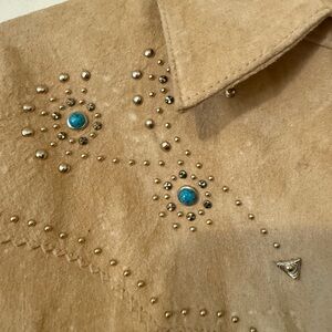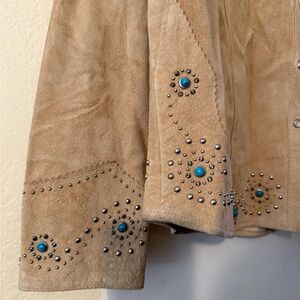 Elegant tan suede jacket with turquoise and silver embellishments. Features studded details and snap button closure. Really pretty. Jacket is good condition but dos haw a couple stains that will probably come out fine with cleaning. See pictures.