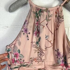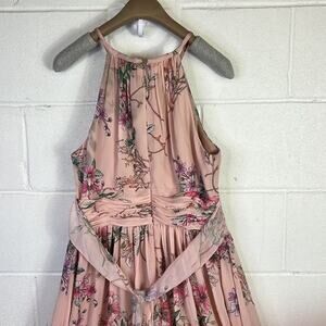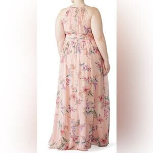 Description: Pink floral printed chiffon (100% Polyester). Gown. Sleeveless. Halter neckline. Hidden back zipper closure. measures 58'' from shoulder to hem, pit to pit 18”.