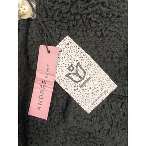 New Andree By Unit sherpa fleece jacket with original branded hangtags attached and a spare button in a small plastic bag at the neckline. Fabric, seams, and buttons are intact with no signs of wear, and the textured fleece surface may show minor lint or wrinkling from storage and handling. Item does not include original retail packaging or additional accessories.