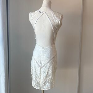 This chic white lace backless mini dress is a must-have for your wardrobe. Its delicate lace design offers a stylish and sophisticated look. Slight mark on right sleeve (pictured).