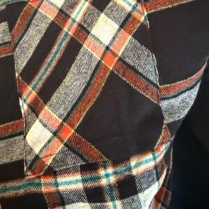 New flannel hoodie with coordinating black sleeves and hood. Two patch front breast pockets. New without tags, never worn.