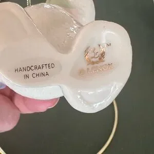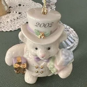 2002 Lenox ornament measuring approximately 4” tall. This adorable teddy bear is carrying 3 gifts with pastel colored ribbons. There is gold trim on his vest buttons, gift bow and holly berries on his hat. Excellent condition without box.