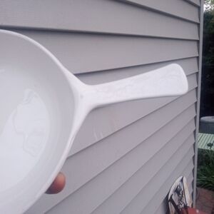 White ceramic pan with a floral design. Features a handle for easy use. Perfect for cooking and serving.