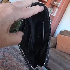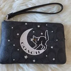 Adorable new without tags Coach black cat & moon Signature corner zip wristlet wallet is in excellent new stored condition. Great black cat and crescent shaped moon silhouette with sparkle stars on black coated canvas with black leather wristlet strap and silver hardware. Top zipper closure cascades over side for easy access with 2 credit card slots on sidewall inside. It measures approximately 6" long by 4" tall. Great Halloween vibe or a wonderful gift for your cat lovers! Certificate of authenticity is included. Guaranteed authentic π€πββ¬οΈπππβ€οΈ