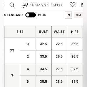 • According to Adrianna Papell website size guide, US 6 (Small) has 28.5 inches waist measurement and 38.5 inch hips measurement.