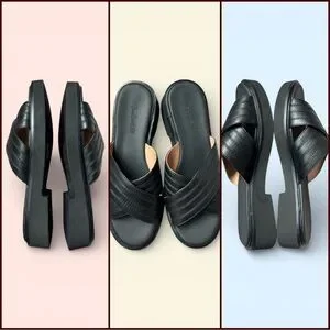 black leather sandals, minimalist slides, crisscross design, slip on flats, women's footwear, casual sandals, comfort footwear, sleek leather, everyday sandals, black slip-ons
