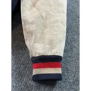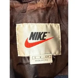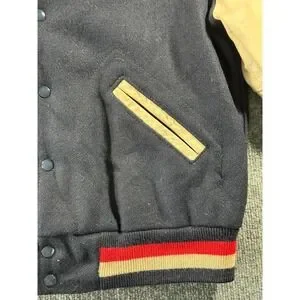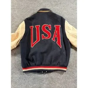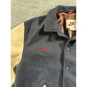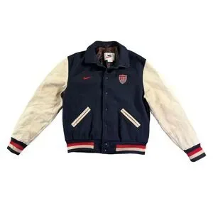 Vintage Nike varsity jacket celebrates US Soccer with a classic wool body and contrasting leather sleeves. This letterman-style piece features an embroidered US Soccer crest and the iconic Nike swoosh on the chest, complemented by striped ribbed cuffs and hem for a timeless athletic look. The snap-button front and welt pockets add functional detail to this heritage sportswear staple. Please note a small hole on the back and some discoloration on the sleeves consistent with age please review pictures