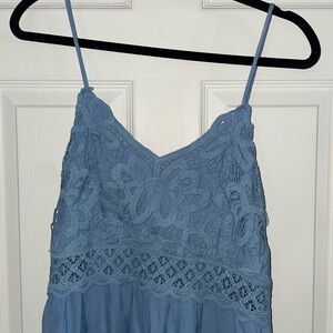 Chic blue sleeveless maxi dress with lace detail. Flowy and stylish for any event.