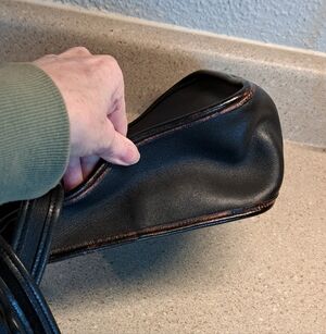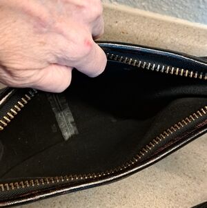 Brass hardware with hangtag. Inside natural leather one slip pocket.