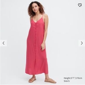 Uniqlo pink button down camisole flare maxi dress new with tags. Deep V-neck, adjustable spaghetti straps, drape fabric made of 100% rayon, unlined. Open neckline with elegant covered buttons for easy outfit changes, loose-fitting, long length, perfect for layering over T-shirts and swimwear.. Very feminine and romantic, it would fit maxi or midi depending on your height. This style is from last year and seems to be discontinued. Marked sized L. All measurements are approximate and taken with the garment laying flat: Armpit to armpit 18.5’’ Total length 45" (from middle of chest). This item comes from a smoke free, pets friendly home. Recycled bags/box used when possible. Please, let me know if you'd like any additional info. Thanks for looking!