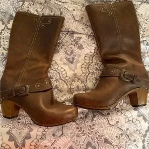 Chic brown heeled boots with buckle detail. Stylish and comfortable for any occasion.