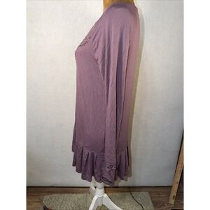 This Matilda Jane small purple top is a stylish and feminine addition to any woman's wardrobe. The lace trim and ruffle bottom accents add a touch of bohemian flair to the tunic-style blouse, while the V-neck and long casual sleeves provide comfort and sophistication. Made of rayon spandex, this blouse is perfect for everyday wear or special occasions, with a loose fit that is both flattering and easy to wear. The floral and peasant-inspired design makes it a versatile choice for any season, showcasing the brand's unique style.