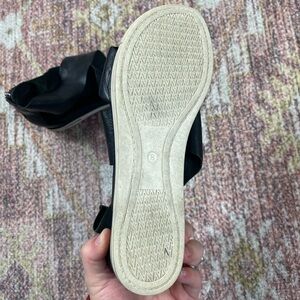 Open toe, wedge heel, cross strap styling.