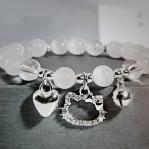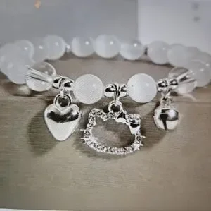 Elegant silver charm bracelet featuring a heart and cat design. Perfect for adding a touch of charm to any outfit.