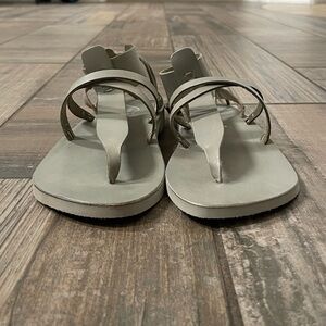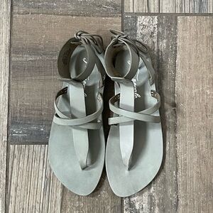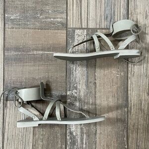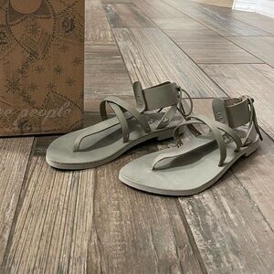 Free People Vacation Day Wrap Sandals in sky. New in box. Strappy leather sandals featuring a wraparound ankle detail with a lace-up back; the partial vegetable-tanned leather sandal molds to your foot and softens with each wear