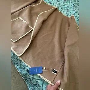 Stylish tan cardigan featuring cream trim. Perfect for layering. Has such a super soft silky feel to it.