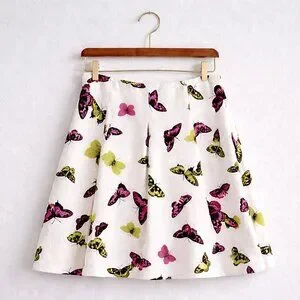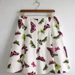 Beautiful Talbots A-line skirt featuring a playful butterfly print in vibrant pink and green on an ivory background. Crafted from a luxe cotton-silk blend with soft pleating for flattering movement. Fully lined and finished with an invisible side zipper for a clean silhouette.