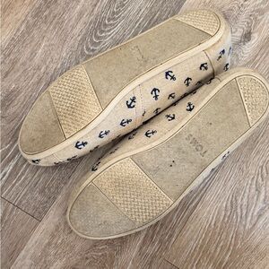 Nautical-themed slip-ons with anchor design. Beige canvas with navy accents.