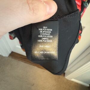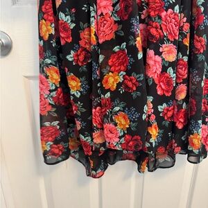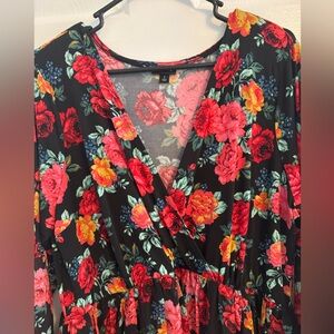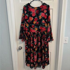 Torrid Floral Print Wrap Top Bell Sleeve Chiffon Dress. Only worn once and in excellent condition. Pretty black dress with pink/red/ blue/orange floral print. Knit over layer of chiffon. Wrap style top and empire waist with bell sleeve. Polyester/Spandex. Torrid size 2X.