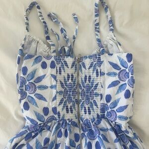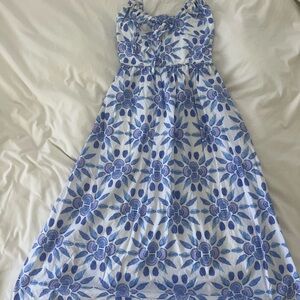 Chic midi dress with blue floral pattern. Features a flattering silhouette. Ideal for any event. Purchased for a Europe trip and worn once.