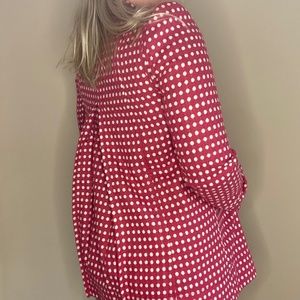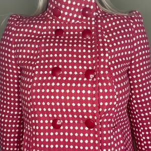 Stylish red pea coat with white polka dots. Double-breasted design. Perfect for a chic look.