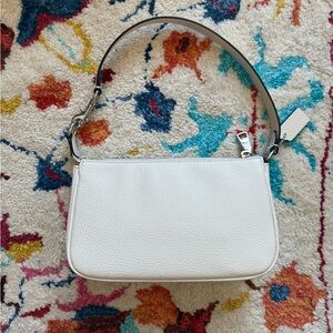 This authentic Coach Nolita 19 has only been worn out once, with no visible signs of wear. The bag features a convertible shoulder strap that is detachable on one side to turn the bag into a wristlet. The bag also features two interior card slots.