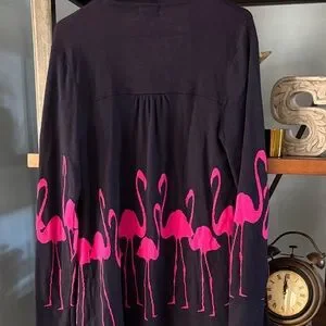 Stylish black sweater with vibrant pink flamingo design. Open front. Perfect for casual outings.
