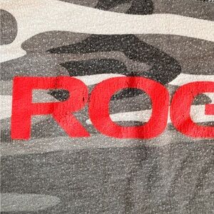Bold camouflage design with striking red logo. Perfect for casual wear or workouts.