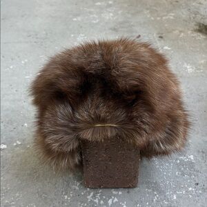 Please look at the pictures. The fur has worn away in a small area in the back. Also, the inside lining as you see needs cleaning. The size label has been removed. Measuring front to back is approximately 7 inches. This is a small hat and I believe fox.