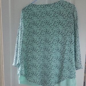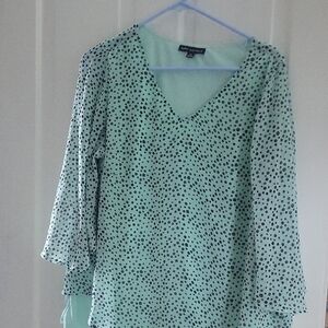 Stylish light green blouse with black dots. Features a flattering V-neck and flowy sleeves. Ideal for casual or dressy occasions.