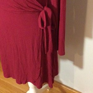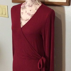 Made of 95% rayon and 5% spandex. Features wrap style that ties at waist and long sleeves. Shows pinprick hole on right sleeve that’s barely noticeable. Stylish and slimming, and in good condition, i.e., no stains or other damage!