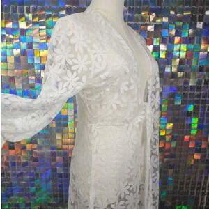 Sheer white floral lace duster cardigan by Ember features an intricate all-over daisy pattern. This lightweight layering piece is designed with a front tie closure, long balloon sleeves with ruffled elastic cuffs, and high side slits for movement. The maxi length and delicate mesh texture make it a versatile choice for styling over dresses, swimwear, or casual outfits.