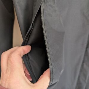 Features: Water-resistant fabric, zip pockets, hooded design