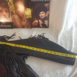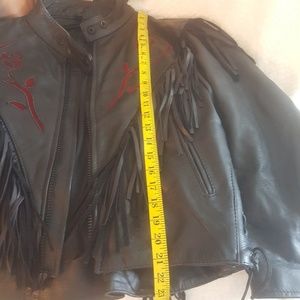 Stylish black leather jacket. Features red floral embroidery. Fringe detailing adds flair.