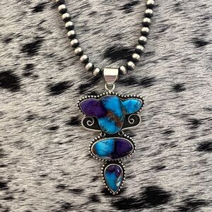 This striking Purple Dahlia Kingman Turquoise statement pendant is handcrafted in .925 sterling silver and features a stylized "cow head" design. The piece showcases vibrant Purple Dahlia Turquoise, which is a unique composite of Arizona turquoise, spiny oyster, and bronze created at the Kingman mine. The pendant is constructed with three distinct tiers: a wide, top stone shaped to resemble a cow head, followed by an oval center stone, and finished with a teardrop-shaped bottom stone. Each cabochon is secured in a classic bezel setting and framed by intricate beaded silver wire and decorative scrolling silver accents with oxidized Sterling silver backdrop.