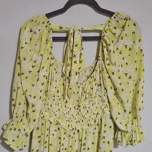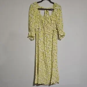 Chrysanthemum is a breezy midi floral dress featuring puff sleeves, ruffle detailing and a delicate tie at the back, a square neckline, and a smocked bust.