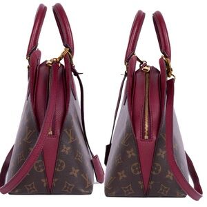 Chic bowling-style tote crafted from iconic LV monogram coated canvas in the rare Raisin color. Designed with vibrant fuchsia leather top handles, polished brass hardware, and two roomy exterior pockets. Includes a removable leather shoulder strap for versatile carry. Zip-top closure opens to a dark pink microfiber interior with an extra slip pocket for easy organization. Date Code: SP3166