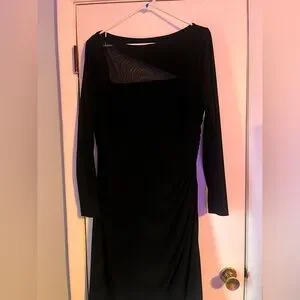 Elegant black dress with long sleeves. Features a stylish draped design. Perfect for evening wear.