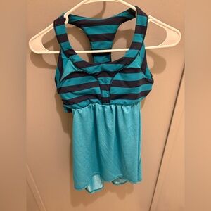 It features a distinctive Surge (turquoise) and Inkwell (dark navy) colorway in a Micro Macro Stripe pattern. A racerback tank top with a built-in bra that provides moderate support. Padding has been removed from the bra.