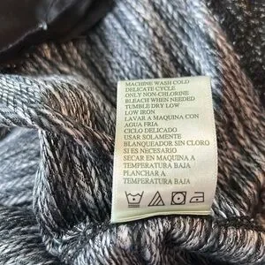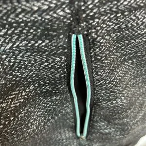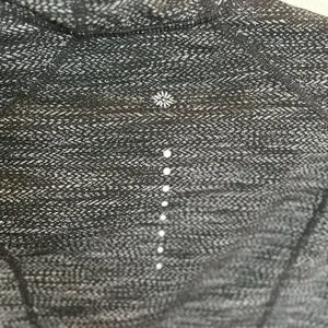 This jacket is a full zip. It had 2 pockets with zippers. It’s black trimmed in teal.