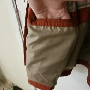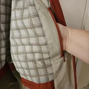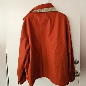 great condition jacket by London Fog. orangey red color, not too bright and overpowering. multiple pockets inside and out. has a hood that can roll up and be zipped away.