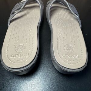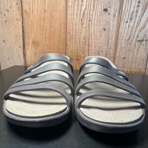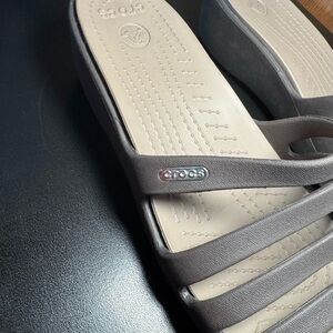 Step into lightweight comfort and effortless summer style with these Crocs Rhonda Wedge Sandals in taupe brown. Featuring a comfortable wedge sole and easy slip‑on, strappy design, they’re perfect for everyday casual wear, errands, vacation outfits, or poolside fun. Preowned and in great condition, these sandals offer the signature Crocs comfort you love with a flattering wedge silhouette that pairs easily with shorts, dresses, or jeans.